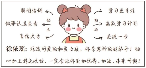 “周家有女名澜依,其人才女风范,大气胸怀,学业人品俱佳,实属典范也。澜依,勤学善思,成绩优异。单元练习,常能拔得头筹。愿君携既有之良品,逐前程之才学,成非凡之自我。”