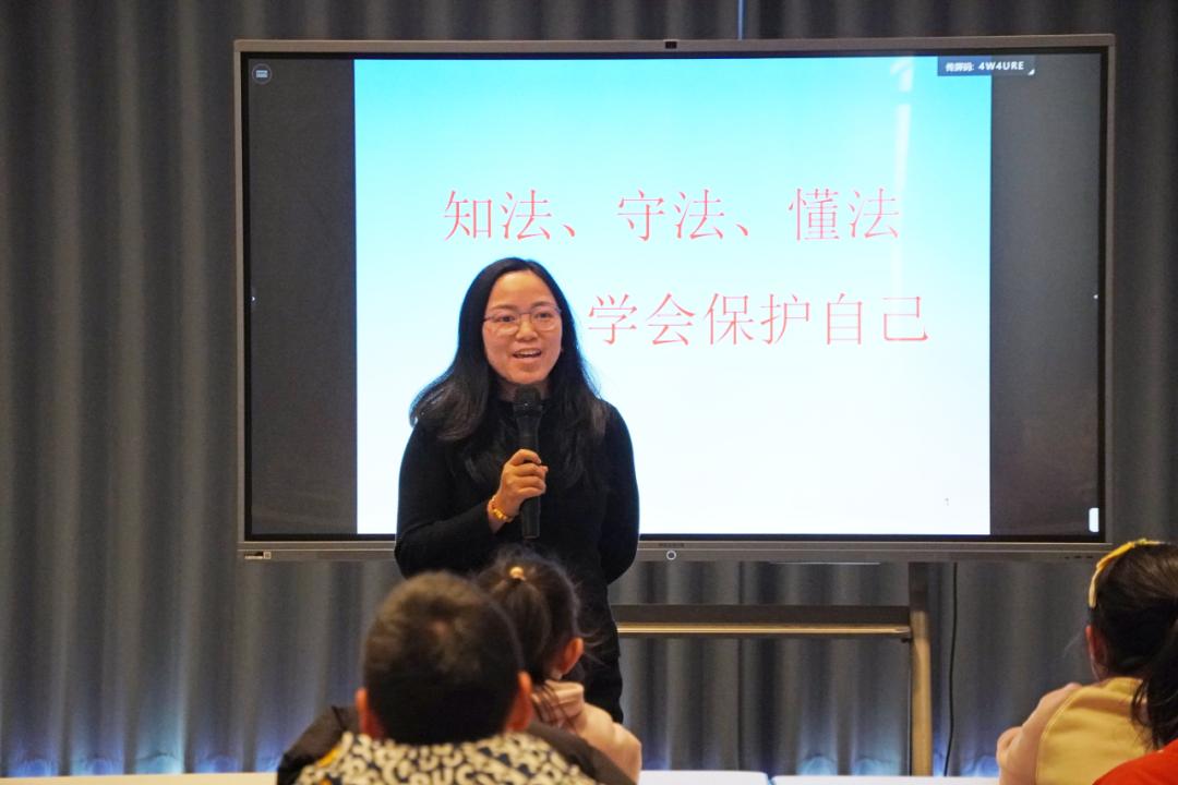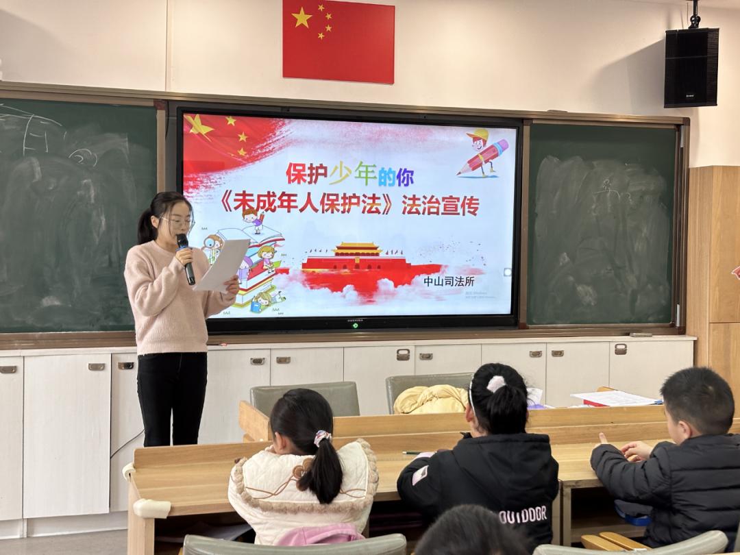 中山司法所工作人员围绕《未成年人保护法》,从内容介绍、网络保护、防拐防骗等角度,结合漫画、案例、视频,以通俗易懂、幽默风趣的语言,为同学们讲解法律知识,并向小朋友们分享了涉及未成年人网络直播、网络欺凌、网络诈骗的案例,引导大家提升安全意识与自我防范能力,学会用法律保护自己。