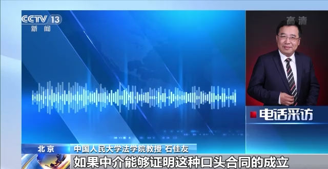 中国人民大学法学院教授 民商事法律科学研究中心执行主任 石佳友:口头形式非常麻烦。如果中介能够证明这种口头合同的成立,法院也是可以支持他的合理请求,比如说有第三方证人。比如说客户和中介通过微信联系,这些证据是可以证明说有这样一个中介合同的成立,而且双方有明确的意向,就是客户委托中介去找客户。