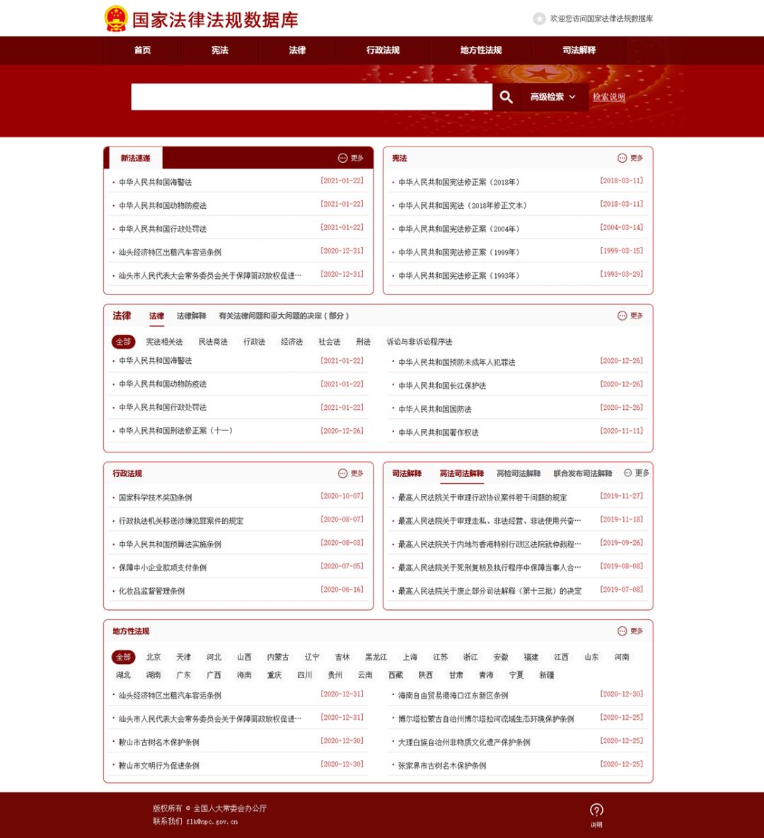 国家法律法规数据库(https://flk.npc.gov.cn/)由全国人大建立并维护,目前登载中华人民共和国的宪法、法律、行政法规、地方性法规以及司法解释。(网站首页参考图1.1)
