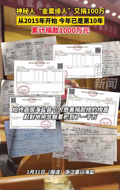4.神秘人10年捐赠1000万元善款:近日,浙江嘉兴海盐县慈善总会又收到神秘人“金粟缘人”捐款的100万元。从2015年到2024年,他每年都会打来100万元善款,总计已捐款1000万元,这些钱帮助了很多困难家庭。“金粟缘人”一直没透露自己的真实身份,每一次表彰会现场座位都是空的。善良会传递更多善良,谢谢你!(人民日报)