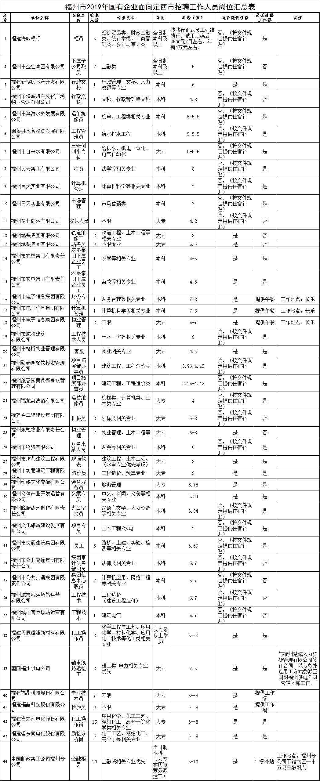 招考单位、岗位、人数及具体要求详见《福州市2019年国有企业面向定西市招聘工作人员岗位汇总表》。