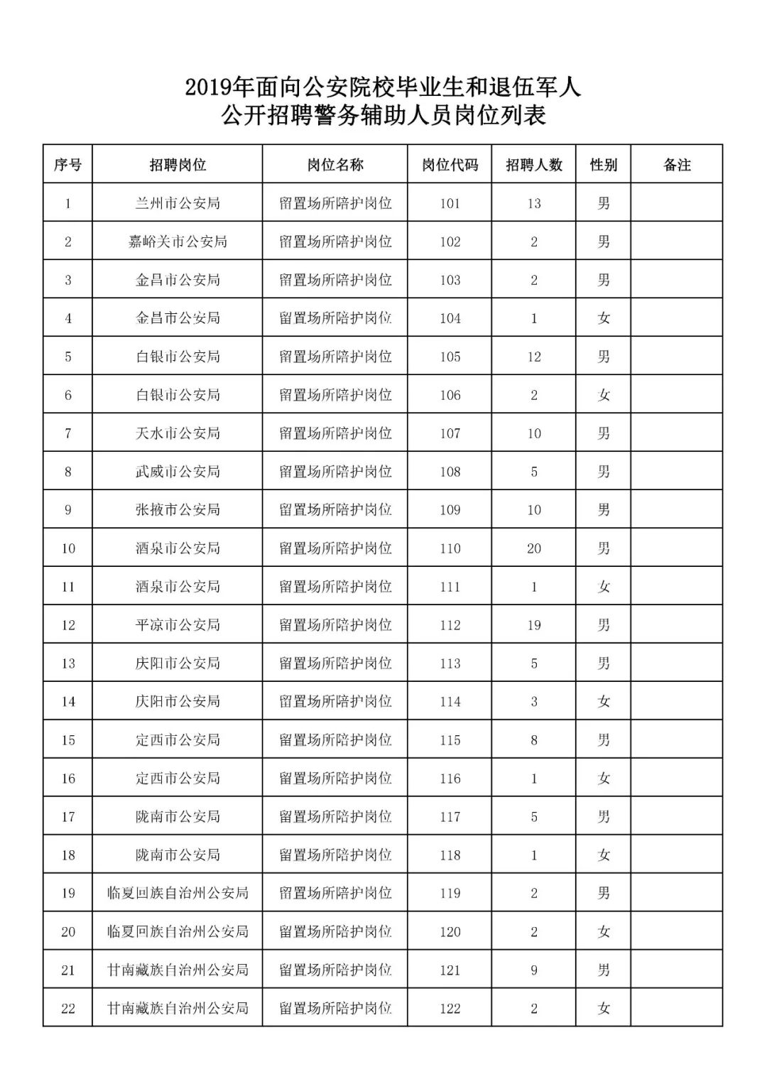 受甘肃省公安厅、甘肃省人力资源和社会保障厅、甘肃省退役军人事务厅委托,甘肃人力资源服务股份有限公司现面向公安院校毕业生和退役军人公开补充招聘警务辅助人员135名,现公告如下: