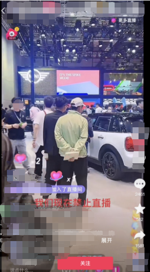“我按照从1号展馆到7号展馆的顺序直播,下午3点多走进了位于7号展馆的宝马MINI展台。”“Tongtong”表示,在前面的6个展馆、包括7号展馆的比亚迪展台进行直播时都很顺利,意外是在宝马MINI展台发生的。
