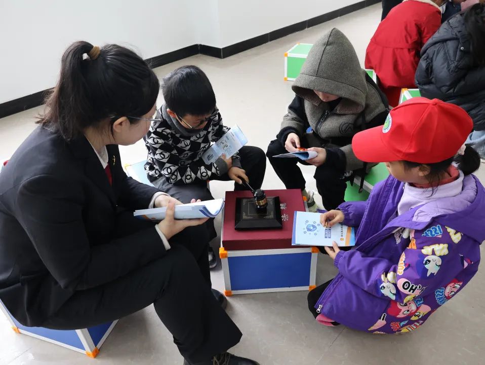 接下来孩子们围坐在两名干警旁边,敲法槌、摸法徽、着法袍......孩子们迅速进入角色,兴奋之情溢于言表。
