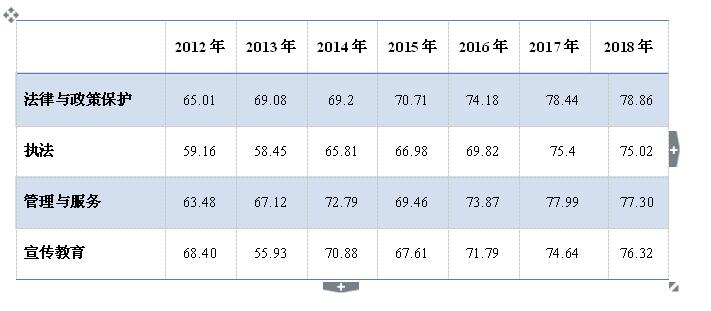 据介绍,2018年满意度分项指标评价中,法律与政策保护满意度最高、宣传教育满意度年度提升最多。其中,法律与政策保护满意度为78.86分,七年来,一直得分最高并始终保持上升态势。宣传教育满意度为76.32分,比2017年提升1.68分,提升幅度最大,其提升得益于对社会宣传工作效果满意度的积极评价。