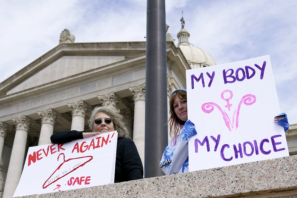 当地时间2022年4月13日,美国俄克拉荷马州,当地民众在州议会大厦手举支持堕胎的标语(资料图)。当地时间2022年5月25日,美国俄克拉荷马州禁止堕胎法案获州长凯文·斯蒂特签字生效,该州成为美国第一个实际禁止堕胎的州。