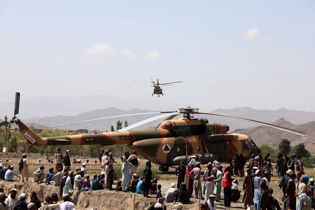 当地时间2022年6月24日,阿富汗帕克蒂卡,地震后平民受到人道主义援助,一架军用直升机空投物资后起飞。阿富汗地震已造成2500多人死伤,超3000座房屋被毁。当地时间2022年6月24日,一名阿富汗临时政府高级官员表示,目前已结束对地震灾区的搜救工作。他补充说,灾区目前仍急需药品和其他重要援助物资。关于为何在地震发生48小时之后停止搜寻工作,该官员并未作出解释。