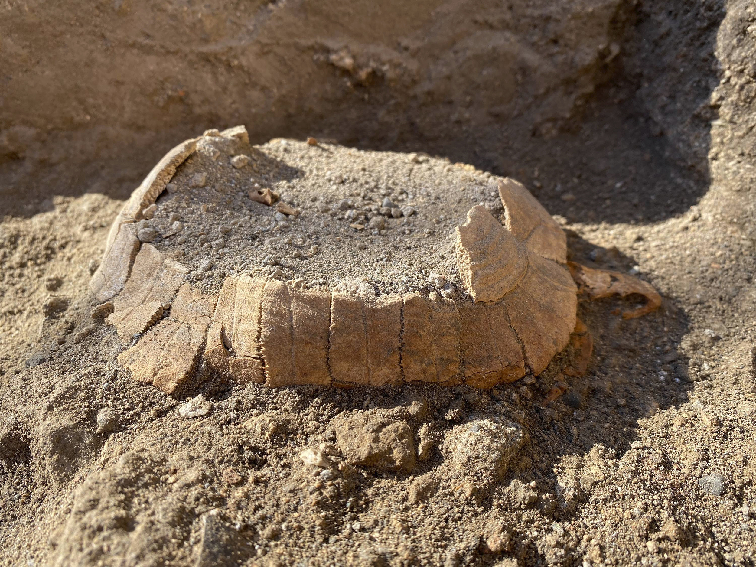 当地时间2022年6月24日公布的图片显示在意大利南部那不勒斯附近,考古学家在庞贝考古公园内的斯塔比安Terme Stabiane地区发现的一只陆龟的遗骸和其产下的蛋,可以追溯到大约2000年前。