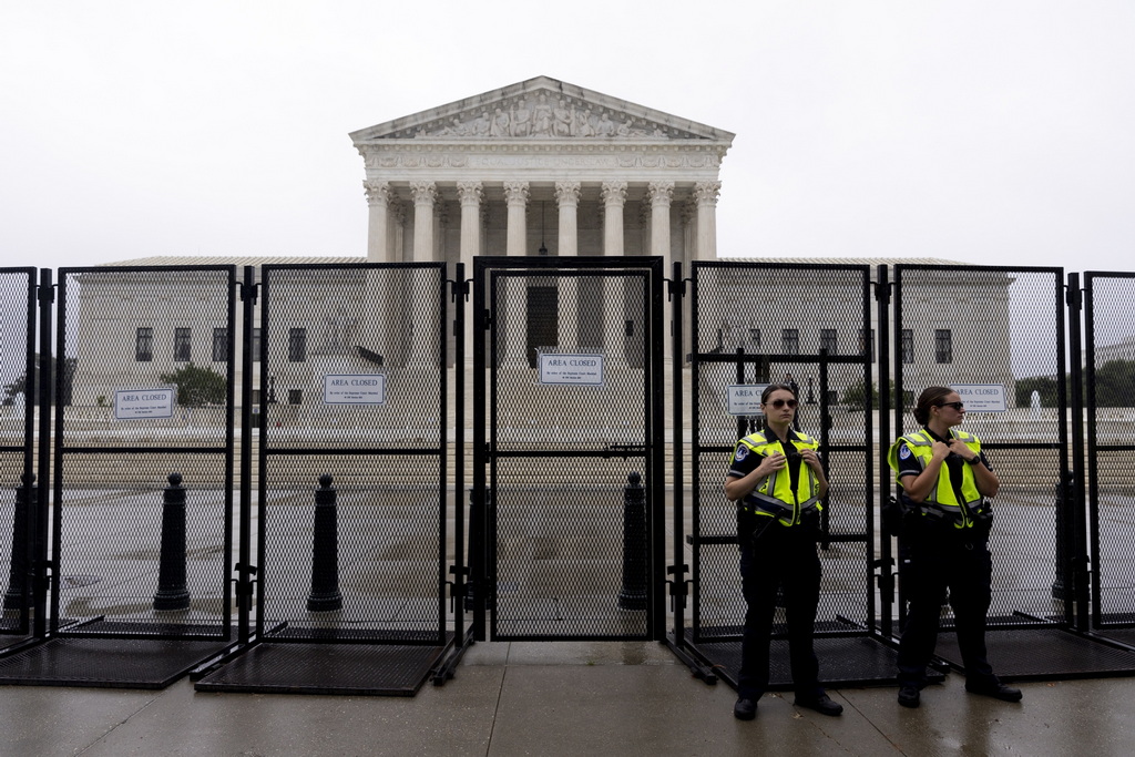 当地时间2022年6月23日,美国华盛顿特区,美国最高法院外竖起拦网,警察在周边巡逻站岗。