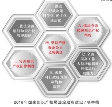 坚持机构改革和事业发展两手抓、两促进,深化知识产权领域改革,构建新的管理运行机制,高效提升管理效能。一是顺利完成重新组建国家知识产权局工作,构建起新的管理体制和运行机制。严格落实中央提出的机构改革目标任务,进一步科学设置部门机构,合理配置权力职责,加强业务整合和人员融合,明显提升知识产权管理效能。二是统筹推进知识产权战略实施,知识产权强国建设迈出新的步伐。印发2018年加快建设知识产权强国推进计划,提出109条具体举措。完成《国家知识产权战略纲要》实施十年评估和《“十三五”国家知识产权保护和运用规划》中期评估,启动知识产权强国战略纲要制定工作。在各项宏观政策措施中,将法治保障作为重要内容,确保各项任务举措和法治政府建设同部署、同落实、同安排。