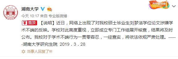 据湖南大学官方微博消息,近日网络上出现对湖南大学硕士毕业生刘梦洁学位论文涉嫌学术不端的反映。学校对此高度重视,立即成立专门工作组展开核查,结果将及时公布。