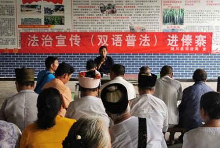 近日,陇川县司法局工作人员到芒拉村委会芒岭村民小组开展“法治宣传(双语普法)进傣寨”活动,发放宪法(傣语版)、“七五”普法(农村篇、法律援助篇)等宣传册300余份。工作人员用傣语详细讲解宪法的性质、法律效力、公民的权利和义务等法律知识,同时结合生动案例,深入浅出地讲解与群众日常生活息息相关的民事法律行为及法律援助制度。双语普法有效调动群众学习法律的兴趣,切实增强群众的法治意识。