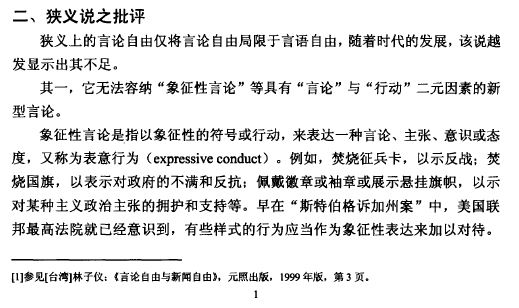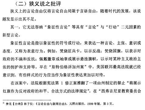 张华银论文第一章言论自由的界定的“狭义说之批判”部分第三段则是,“象征性言论是指以象征性的符号或行动,来表达一种言论、主张、意识或态度,又称为表意行为。例如,焚烧征兵卡,以示反战;焚烧国旗,以表示对政府的不满和反抗;佩戴徽章或袖章或展示悬挂旗帜,以示对某种主义政治主张的拥护和支持等。早在‘斯特伯格诉加州案’中,美国联邦最高法院就已经意识到,有些样式的行为应当作为象征性表达来加以对待。”