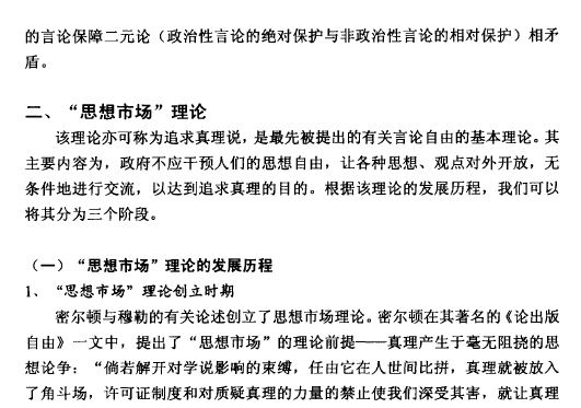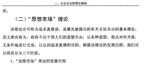 譬如,陈爱月论文在第三章言论自由的理论基础的“‘思想市场’理论”部分第一段写道:“该理论亦可称为追求真理说,是最先被提出的有关言论自由的基本理论。其主要内容为,政府不应干预人们的思想自由,让各种思想、观点对外开放,无条件地进行交流,以达到追求真理的目的。根据该理论的发展历程,我们可以将其分为三个阶段。”