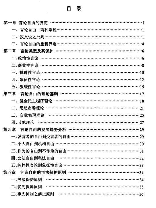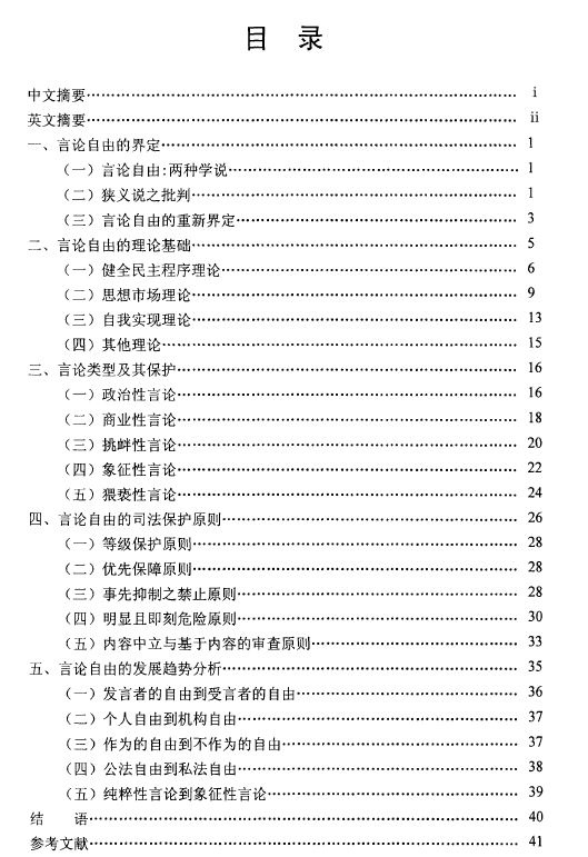 譬如陈爱月论文的五大章节分别为言论自由的界定、言论类型及其保护、言论自由的理论基础、言论自由的发展趋势分析、言论自由的司法保护原则。