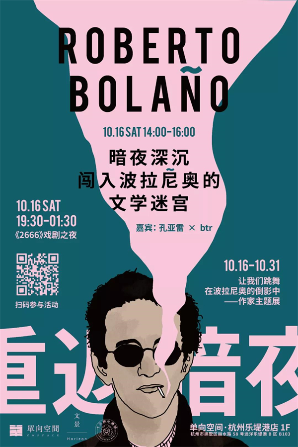 “波拉尼奥完全是个世界公民,“余华说,“而马尔克斯就是一个小镇居民,威廉·福克纳也是。”波拉尼奥留下了一笔丰厚的遗产:10部小说,4部短篇小说集以及3部诗集。而这笔文学遗产,也构成了“波拉尼奥的文学迷宫”。10月16日,单向空间联合世纪文景,邀请作家、译者孔亚雷和btr,举办波拉尼奥对谈,此外还有《2666》戏剧之夜和主题展览,从白天到暗夜,闯入波拉尼奥的文学迷宫,在波拉尼奥的倒影中跳舞。