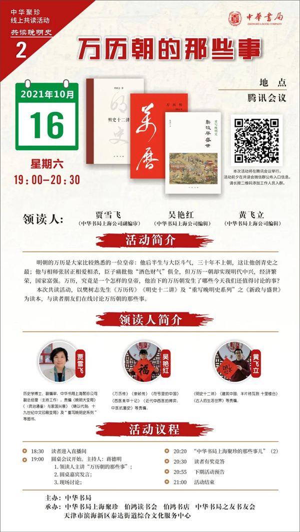 明朝的万历是大家比较熟悉的一位皇帝:他后半生与大臣斗气,三十年不上朝,这让他创青史之最;他与相师张居正相爱相杀,臣子痛批他“酒色财气”俱全,但万历一朝却实现明代中兴,经济繁荣,国家富强。万历,究竟是一个怎样的皇帝,他治下的万历朝发生了哪些今天我们还值得讨论的事?本次共读活动,以樊树志先生《万历传》《明史十二讲》及“重写晚明史系列”之《新政与盛世》为读本,与读者朋友们在线讨论万历朝的那些事。