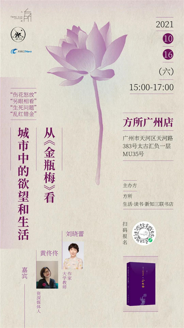 你不一定全部读过《金瓶梅》,但一定听说过。究竟是“云霞满纸”,还是“教坏人心”?是欲望沸腾?还是一片荒凉?它到底是一本什么样的书?从这部书中,我们可以看到什么?学会什么?思考什么?10月16日,作家刘晓蕾将携新作《作为欲望号的<金瓶梅>》,做客方所广州店,与资深媒体人黄佟佟一起,带大家领略这部伟大的“凡人生死书”,一起看见人心,洞察世相,一起思考生与死,远离恐惧,放下傲慢与偏见,获得爱的能力。