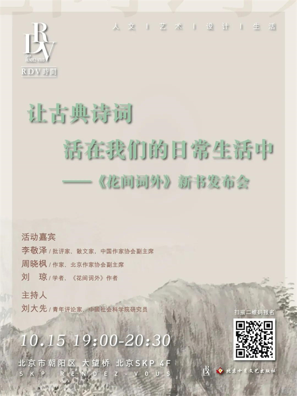 著名学者、作家刘琼,以中国古典诗词中的草木入题,追寻草木中的文学与艺术、生活与人生的隐秘关联,探讨中国文化的内在审美方式以及中国人日常生活方式。其新近创作的散文集《花间词外》,彰显着生活与文化本身的质与美。10月15日晚,批评家、散文家李敬泽,作家周晓枫,青年评论家刘大先,以及《花间词外》作者刘琼,将做客北京SKP,带您走进传统诗词的清婉逸趣,揭秘如何将日常之琐碎种种,过成风花雪月的诗词歌赋。