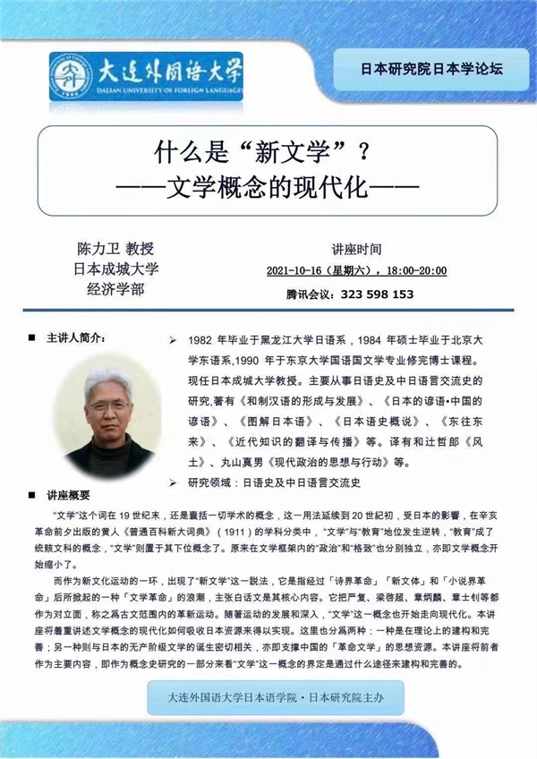 “文学”这个词在19世纪末,还是囊括一切学术的概念,这一用法延续到20世纪初,受日本的影响,在辛亥革命前夕出版的《普通百科新大词典》(1911)的学科分类中,“文学”与“教育”的地位发生逆转,“教育”成了统赅文科的概念,“文学”则置于其下位概念了。而作为新文化运动的一环,出现了“新文学”这一说法,它是指经过“诗界革命”“新文体”和“小说界革命”后所掀起的一种“文学革命”的浪潮,主张白话文是其核心内容。随着运动的发展和深入,“文学”这一概念也开始走向现代化。本讲座将着重讲述文学概念的现代化如何吸引日本资源来得以实现。这里也分为两种:一种是在理论上的建构和完善;另一种则与日本的无产阶级文学的诞生密切相关,亦即支撑中国的“革命文学”的思想资源。本讲座将前者作为主要内容,即作为概念史研究的一部分来看“文学”这一概念的界定是通过什么途径来建构和完善的。