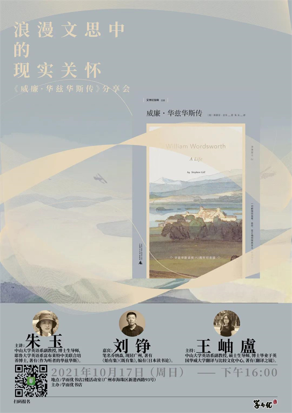 在本次活动中,著名学者刘铮将与《威廉·华兹华斯传》译者朱玉一起聊聊华兹华斯的诗歌思想与浪漫文思中的现实关怀。嘉宾主持、中山大学英语系王岫庐副教授也会谈谈浪漫主义理想在我国的发生、传播与影响。