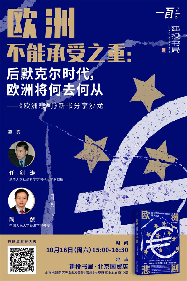 对于身处这个巨变时代的我们来说,欧盟及欧元的诞生是20世纪以来世界史上的关键事件,也是人们关于世界的认知架构的必要组成部分。不了解欧洲,我们很难说自己了解了这个世界。为此,10月16日下午,建投书局联合一頁folio邀请政治学家、清华大学政治学教授、《欧洲悲剧》中文版导读作者任剑涛,以及经济学家、中国人民大学经济学院教授陶然莅临建投书局·北京国贸店,共同探讨——后默克尔时代,欧洲将会何去何从?