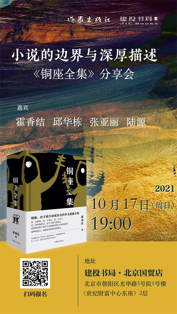 一座村庄,何以成为一部小说?语言、植物、动物,乃至于风俗习惯,如何成为一部小说里的人物?出入于这座村庄的个人,又在这部小说里充当什么样的角色?10月17日晚,《铜座全集》作者霍香结与两位杰出的小说家邱华栋、陆源及作家出版社有限公司总编辑张亚丽将相聚建投书局·北京国贸店,由本书说开去,分享在他们心目中,当代汉语小说乃至于整个文学世界的坐标、边界与整体风貌。