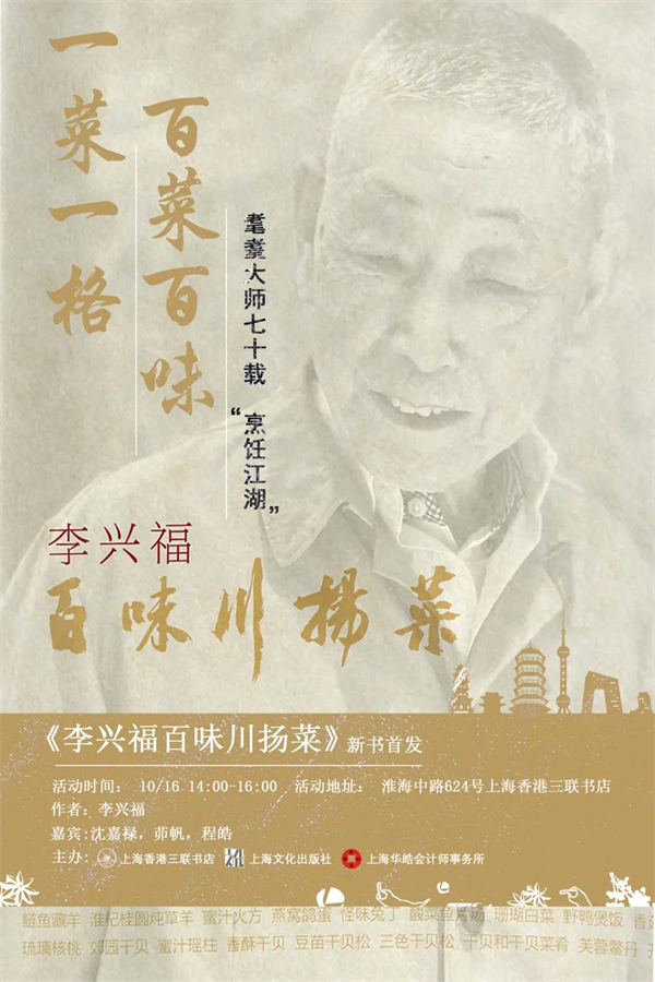 出生于上海川沙的李兴福,是首批注册的中国烹饪大师,13岁在上海五马路(现广东路)上的正兴菜馆学烹饪,并拜上海何派川菜第二代传人钱道源为师,后又拜在何派川菜创始人何其林之弟、何派川菜第二代传人何其坤门下。《李兴福百味川扬菜》是他七十余载烹饪经验的总结,记录了“耄耋厨师七十载的‘烹饪江湖’经历”。周六下午,李兴福将带着这本新书,与几位嘉宾一起,分享上海滩“海派川菜”从诞生到兴盛的历史。