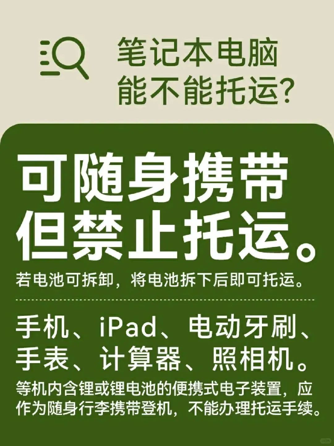 可随身携带、但禁止托运(若电池可拆卸,将电池拆下后即可托运)