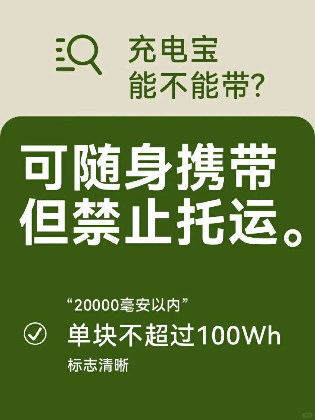 标志清晰、单块不超过100Wh、20000毫安以内——可随身携带但禁止托运
