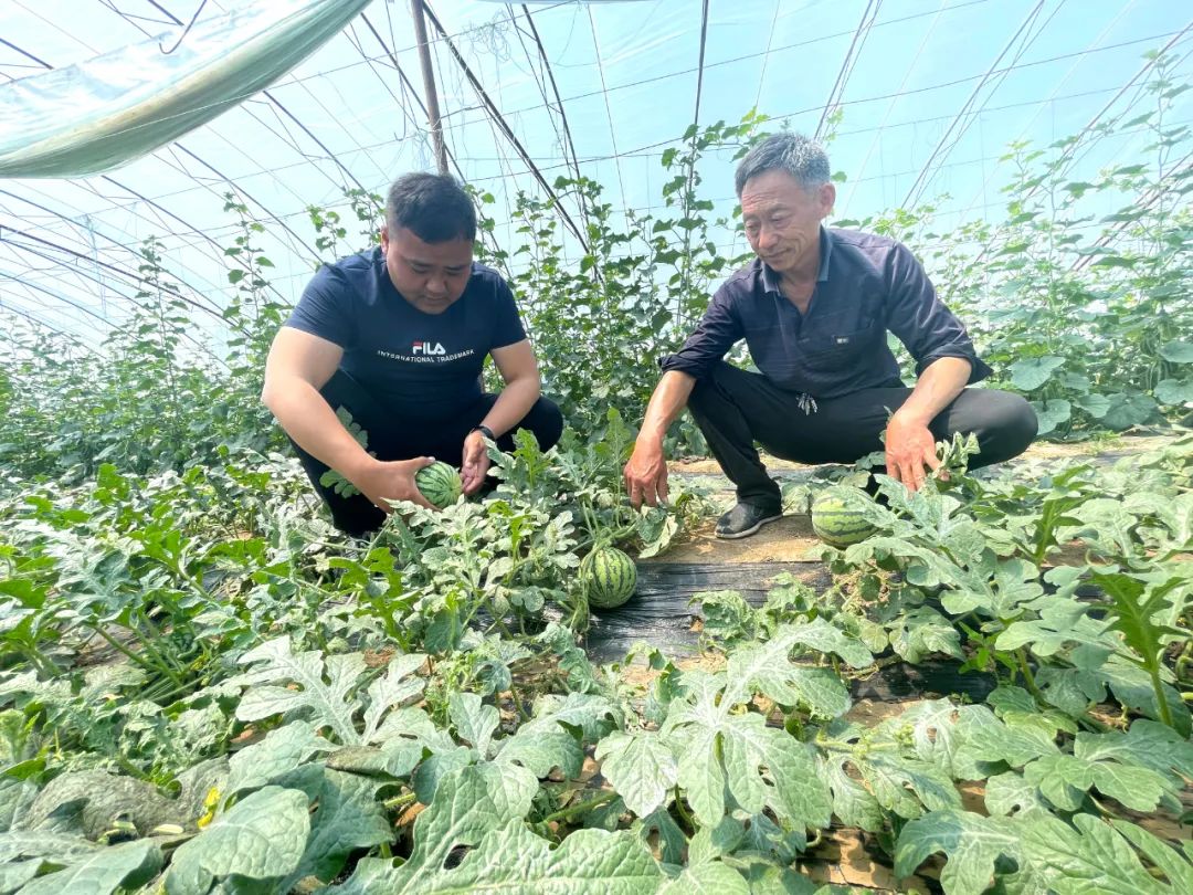 杨广蒙(左)与村民交流西瓜种植经验(张爱华供图)