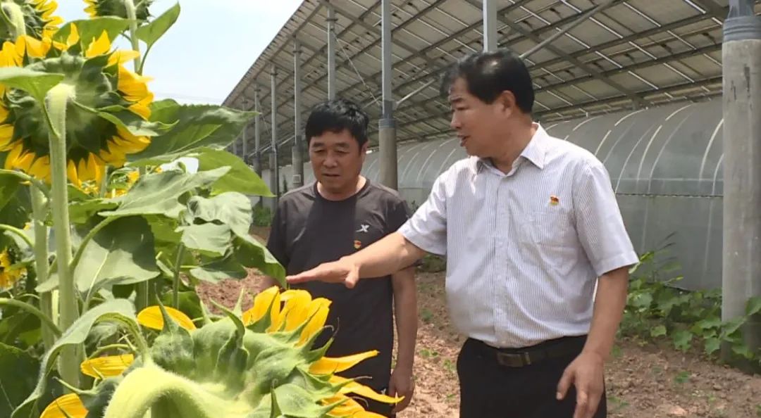 曹传增(右)与村民交流向日葵种植技术(张爱华供图)