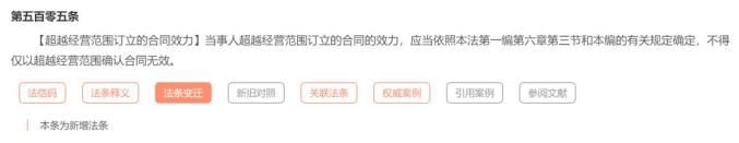 《民法典》第505条是关于当事人超越经营范围订立合同效力的规定,明确了超越经营范围不是导致合同无效的事由,合同的效力应当按照《民法典》总则编民事法律行为的效力一节和合同编有关合同效力的规定进行判断。《民法典》第505条源自1999年12月19日公布的《合同法司法解释(一)》第10条“当事人超越经营范围订立合同,人民法院不因此认定合同无效。但违反国家限制经营、特许经营以及法律、行政法规禁止经营规定的除外”的规定,《民法典》吸收了该条司法解释的内容,并在此基础上进行了修改完善,属于新增规定。以下小编就《民法典》第505条相关的法条、裁判规则和司法观点予以整理,供读者更好地理解该条内容。
