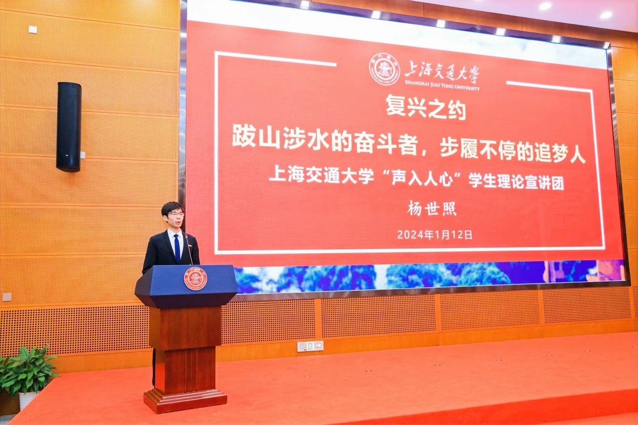 上海交通大学马克思主义学院杨世照同学作题为《复兴之约:跋山涉水的奋斗者,步履不停的追梦人》的宣讲。他以上海交通大学孔海南教授团队治理洱海的动人事迹切入,讲述了新时代的“老人与海”。孔海南教授带领团队坚守一线十几载,与当地各族人民密切配合,让曾经不堪重负的洱海逐渐恢复清澈,让海菜花重新绽放,推动“绿水青山”向“金山银山”转化。他指出,以孔海南等为代表的交大科学家们充分体现了科学家精神与教育家精神,鼓舞着青年学子报国为怀。