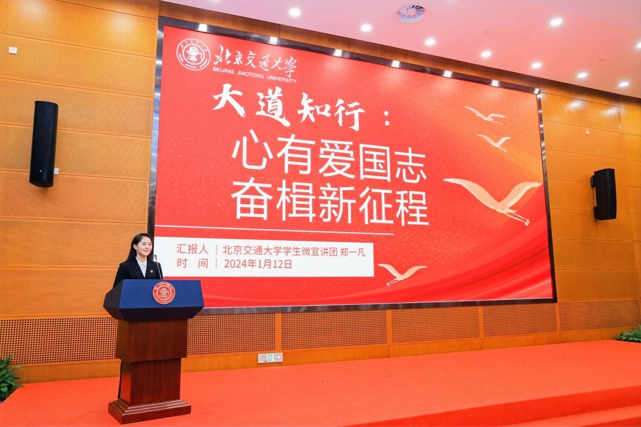 北京交通大学马克思主义学院郑一凡同学作题为《大道知行:心有爱国志 奋楫新征程》的宣讲。她从北京交通大学校友、“五四”新文化运动旗手,著名的文学史家和社会活动家郑振铎先生引入,讲述了北京交通大学“公益桥-小桥工程团队”7年来辗转边远山区搭建利民之桥,以及学校艾渤教授及其团队为中印尼共建“一带一路”的旗舰项目雅万高铁做出重要贡献等事迹,激励当代中国青年的爱国之情、砥砺强国之志、实践报国之行,让爱国主义精神在广大青年学生心中牢牢扎根。