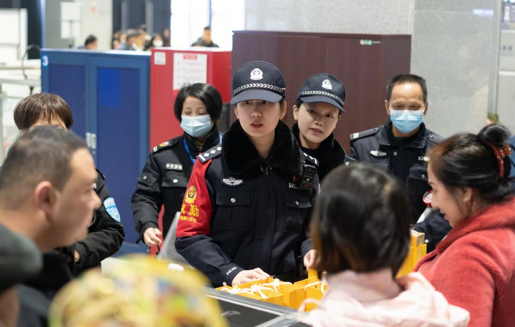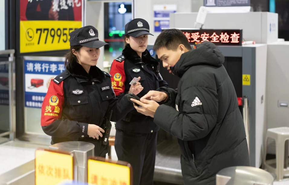 图为民警龙露珠、易慧娟在车站执勤核查人员信息。