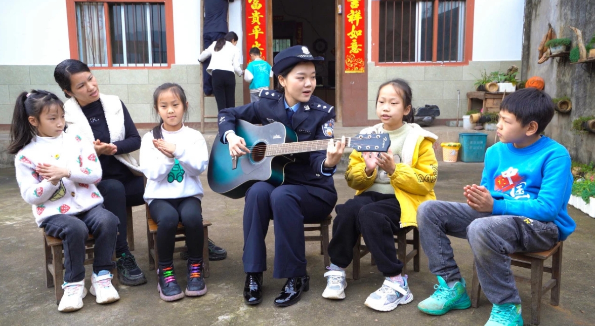 图为民警李艳宇进村入户把安全知识编成儿歌弹唱给学生听。