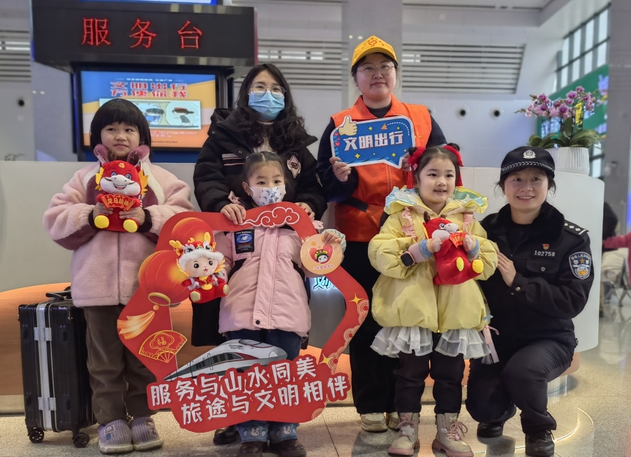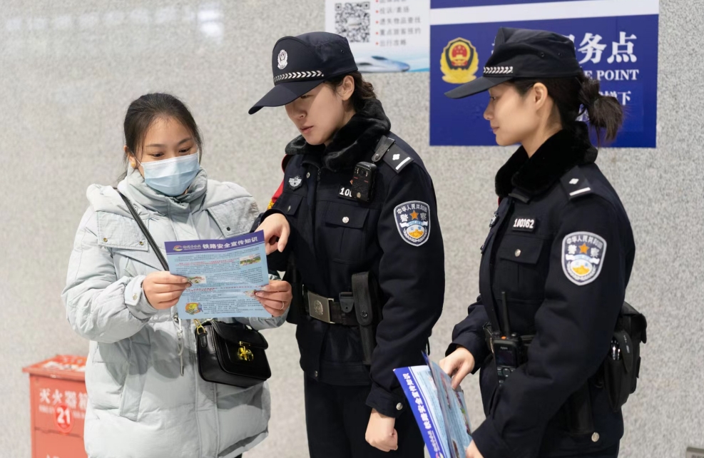 图为民警易慧娟、龙露珠在为旅客开展法治宣传。