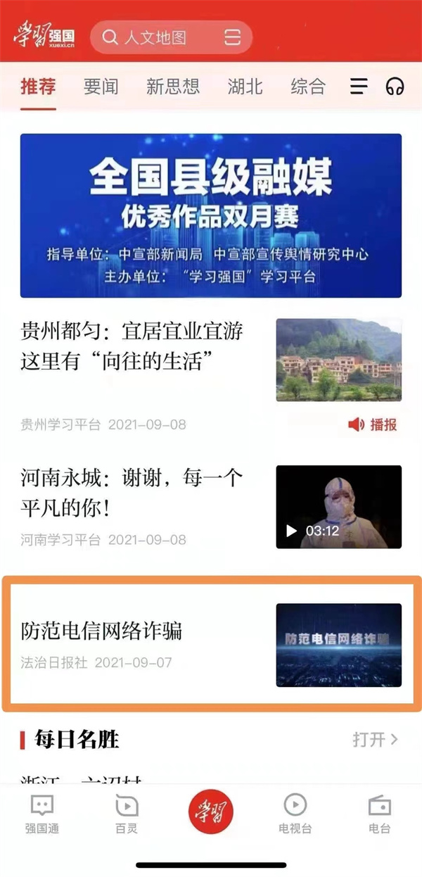 2021年9月,《防范电信网络诈骗》系列普法节目被学习强国首页推荐