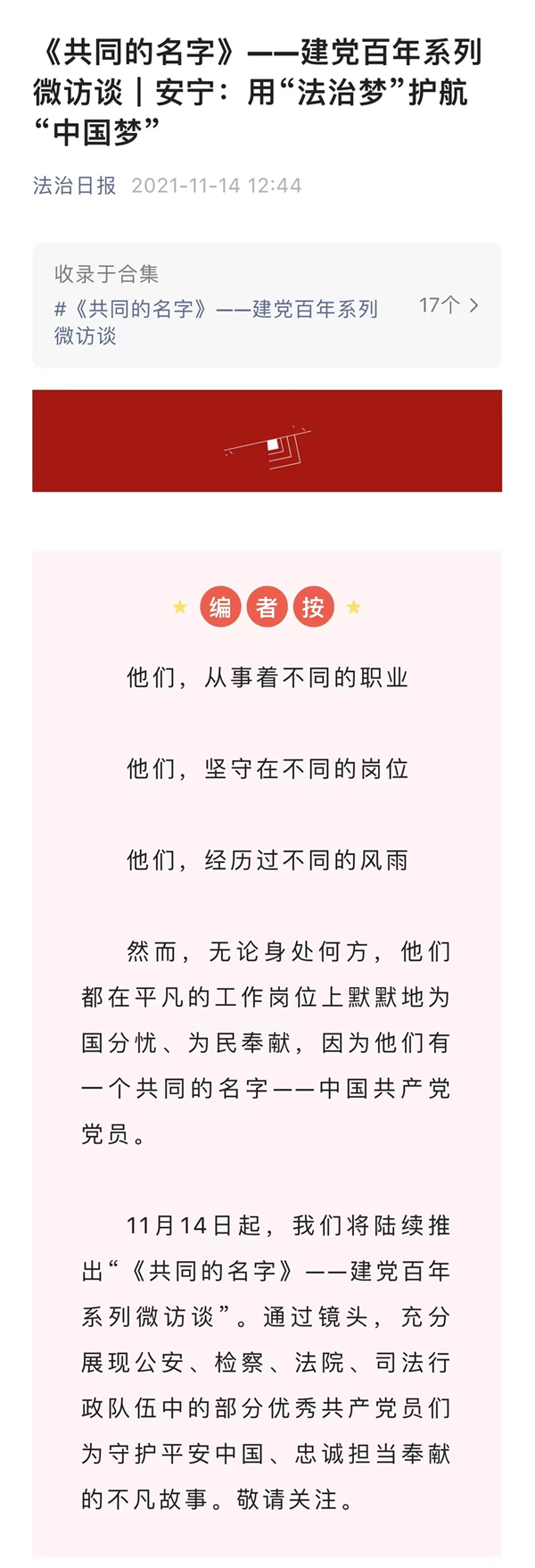 2021年11月14日至30日,法治日报微信公众号推出系列微访谈《共同的名字》,用镜头生动展现政法战线优秀共产党员在平凡岗位上的不平凡故事(点击图片查看)