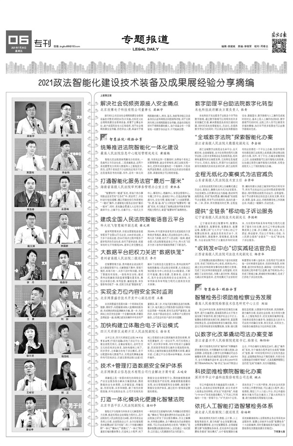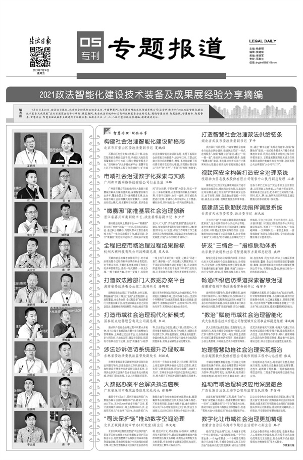 2021年7月30日,《法治日报》5至8版推出《2021政法智能化建设技术装备及成果展经验分享摘编》(点击图片查看)