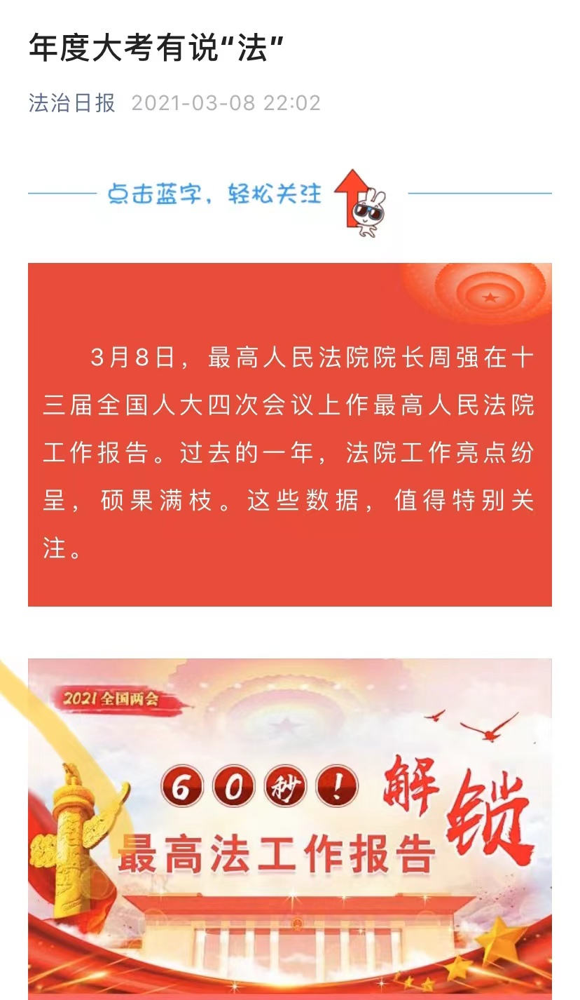 2021年3月8日,法治日报微信公众号推出图解《年度答卷请“检”阅》《年度大考有说“法”》,生动、直观展示“两高”一年工作成绩(点击图片查看)