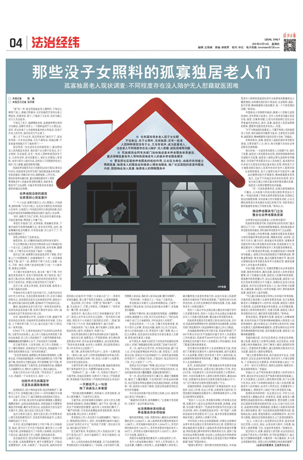 《法治日报》2021年10月12日至14日4版连续推出调查报道,聚焦老年人生存现状和精神世界,语言生动、笔触感人、情感真挚,引发读者强烈共鸣(点击图片查看)