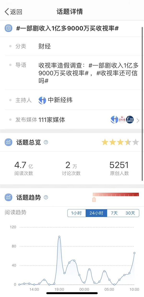 《一部剧收入1亿元,9000万元用来买收视率》微博话题阅读量高达4.7亿