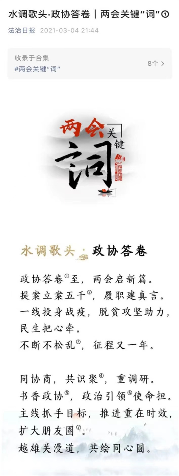 2021年3月4日,法治日报微信公众号推出“两会关键‘词’”①《水调歌头·政协答卷》,本报上海记者站站长余东明书写书法作品(点击图片可查看)