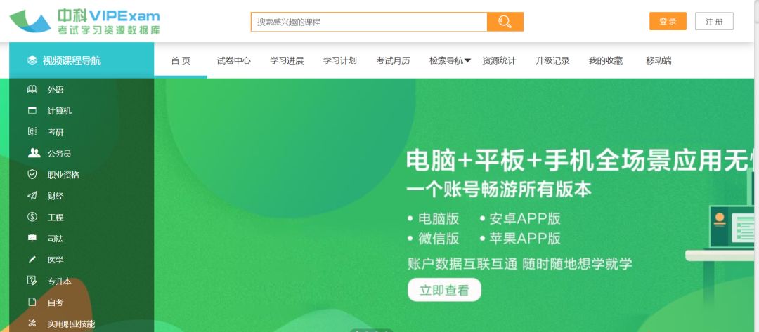 中科VIPExam考试库收录外语、考研、公务员、职业资格、自考、财经、工程、医学等12大类2100多种考试科目的33000节视频课程、24万套历年真题与模拟试卷。