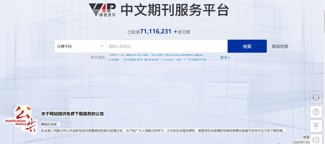疫情期间,维普中文期刊数据库对个人免费开放下载。读者仅需按流程注册个人账户即可。
