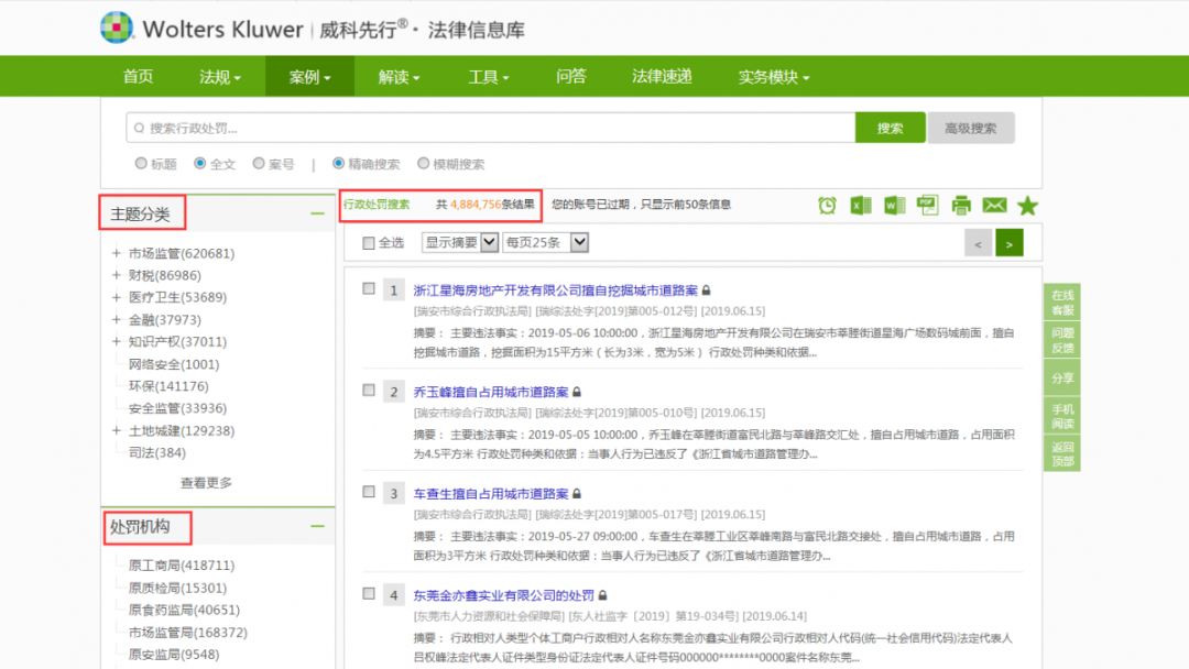 1.威科先行的行政处罚案例库——威科的案例库中有一个行政处罚案例库,汇集了400多万的行政处罚案例,筛选做的很清楚,这个对企业法务应该比较有参考价值。