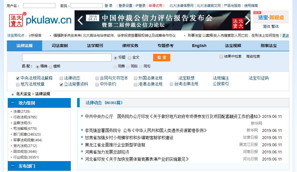 (2)内容版块种类庞杂,除了法律法规,还有视频、英文、培训、行政处罚、法律考试、银行专题、检察文书、刑事法宝、IP法宝等等。